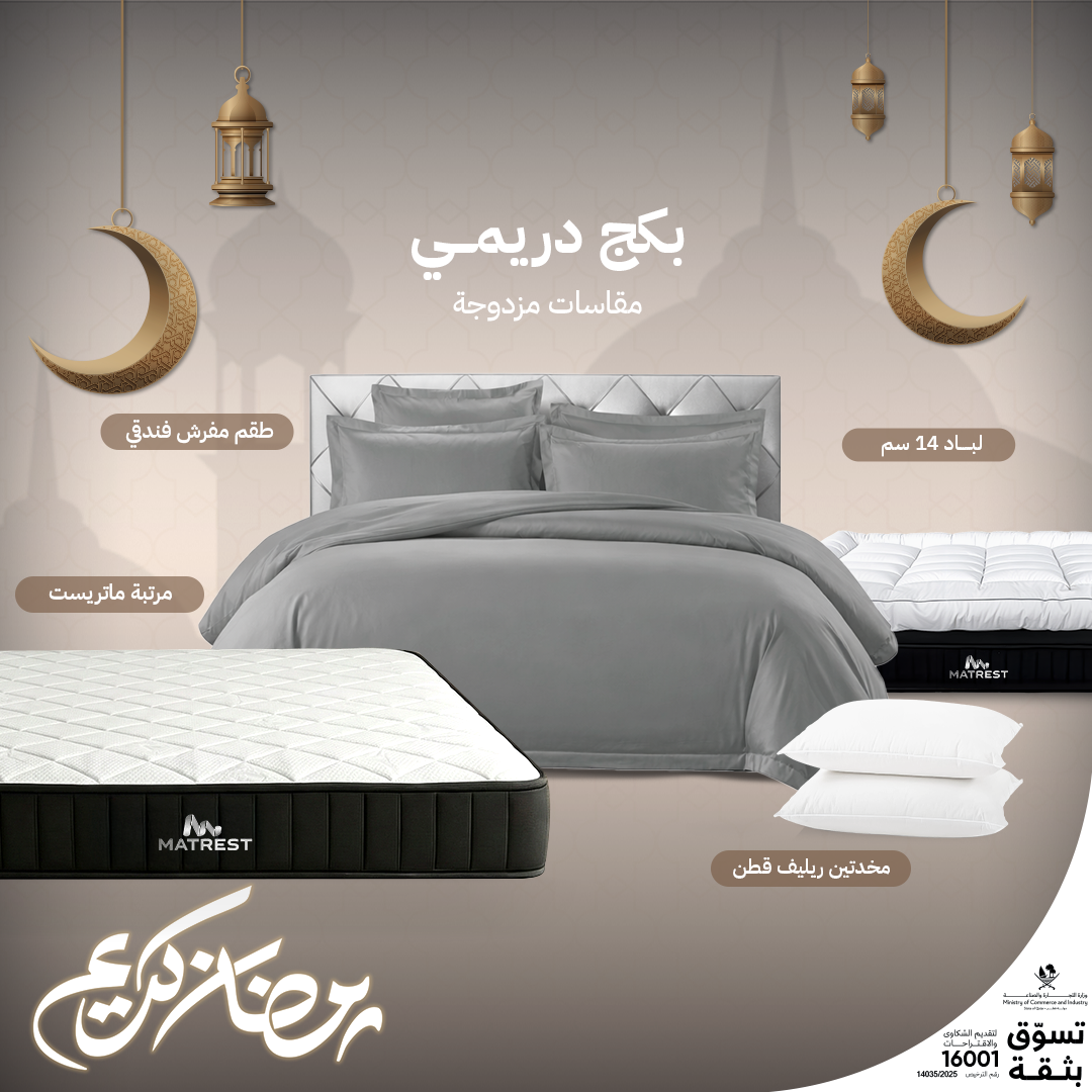 حوّل نومك إلى تجربة استثنائية مع بكج دريمي، المجموعة المتكاملة المصممة لتمنحك الراحة والرفاهية في كل تفاصيل نومك. يجمع هذا البكج بين مرتبة فاخرة ومنتجات نوم فندقية عالية الجودة لتجعل كل ليلة أقرب إلى نومة الأحلام.
