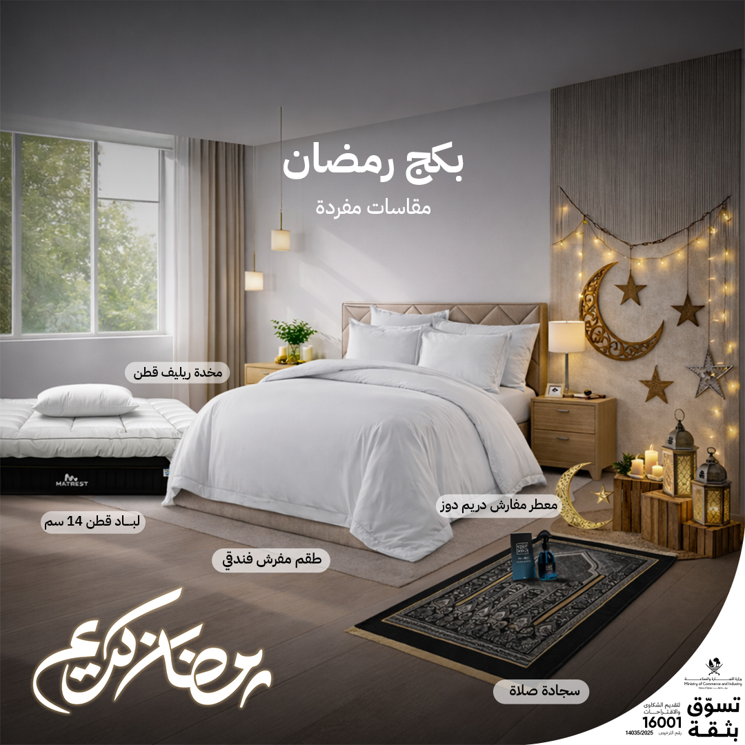 حوّل نومك إلى تجربة استثنائية مع بكج رمضان المصمم ليمنحك الراحة والرفاهية في كل ليلة. يحتوي هذا البكج على مجموعة متكاملة من منتجات النوم الفاخرة المصنوعة من القطن الفاخر والحشوة المريحة لتضمن لك تجربة نوم عميقة وتنقل لك تجربة النومة الفندقية.