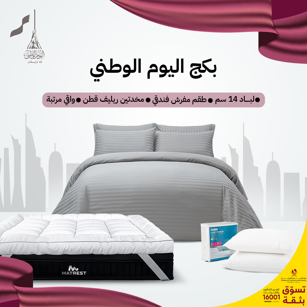 حوّل نومك إلى تجربة استثنائية مع بكج اليوم الوطني المصمم ليمنحك الراحة والرفاهية في كل ليلة. يحتوي هذا البكج على مجموعة متكاملة من منتجات النوم الفاخرة المصنوعة من القطن الفاخر والحشوة المريحة لتضمن لك تجربة نوم عميقة وتنقل لك تجربة النومة الفندقية.